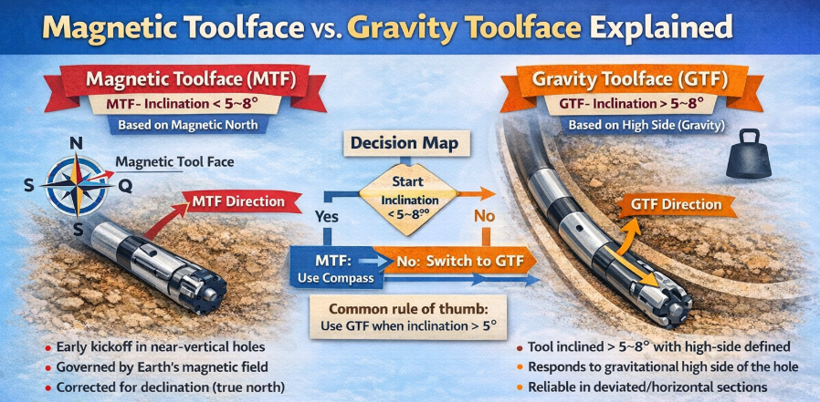In near-vertical wells, gravity does not provide a strong or reliable reference for defining the “up” direction of the borehole. As inclination increases, however, gravity becomes the dominant and most intuitive reference for steering. For this reason, magnetic toolface is used early in the well, while gravity toolface is used once sufficient deviation has been established.